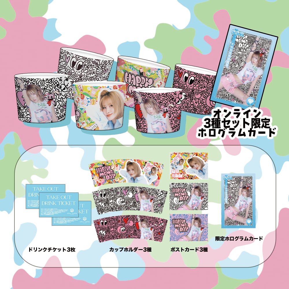 送付の際、画像のカップホルダー3種+特典ポストカード3種+オンライン限定ホログラムトレカ1枚も付属します。
